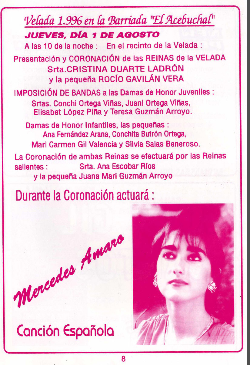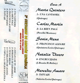 En mayo de 1996 se presenta al II Certamen de canción española ‘Memorial Maestro Jaén’, un concurso de jóvenes intérpretes celebrado a nivel nacional, organizado por la Asociación ‘Amantes de la copla’. Se celebra en el teatro Imperial de la Línea y la final tiene lugar en el teatro Florida de Algeciras. En dicho concurso obtiene el accesit a la dicción. Meses después graba un disco de copla junto con el resto de finalistas del concurso, en los estudios de Toni Carmona en Málaga. El doce de julio canta en la coronación de la reina de la feria de La Línea y en septiembre de ese mismo año canta en el hotel Reina Cristina donde es entrevistada por la periodista María Quirós para la televisión Campo de Gibraltar.